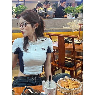 2024 春夏トップス プリント半袖 Tシャツ 韓国 ラウンドネック スリム 可愛い風へそ出し ショート おしゃれスリーブ カジュアルサイドコーデ丈 ファッション系レディースフレンチお出かけ T