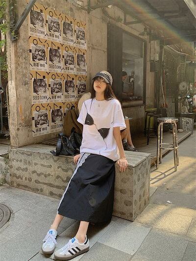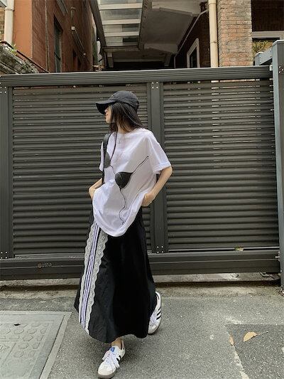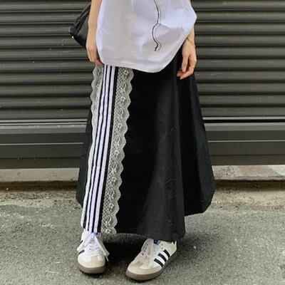 2024 春夏スカート ロング丈 Aライン ストライプ レース ハイウエスト 美脚効果 脚長効果 細見え 夏 黒 ブラック おしゃれ かわいい 甘辛 韓国ファッション レディース お出かけ