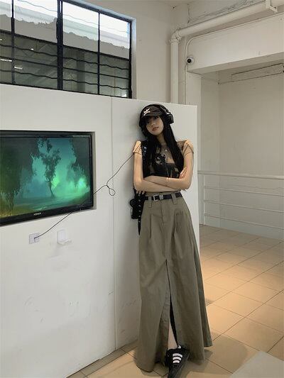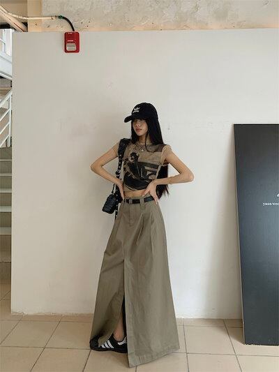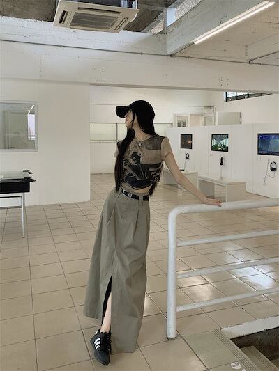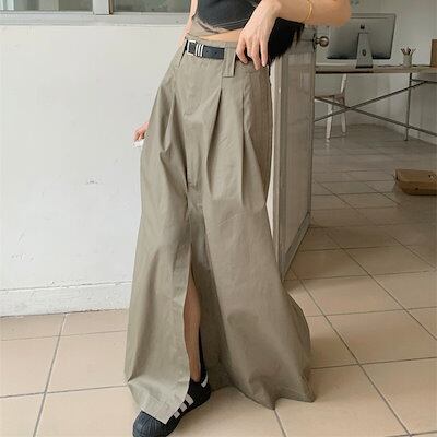 2024 春夏スカート ロング丈 Aライン スリット フロントオープン ハイウエスト 美脚効果 脚長効果 細見え 夏 カーキ おしゃれ かわいい 韓国ファッション レディース お出かけ