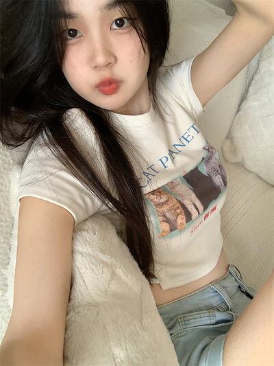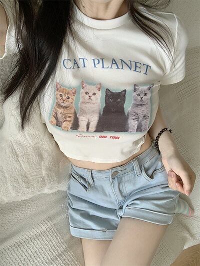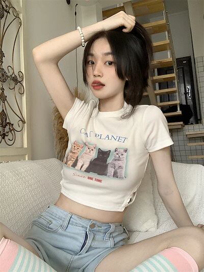 2024 春夏トップス プリント半袖 Tシャツ 韓国 ラウンドネック スリム かわいい ショート おしゃれスリーブ カジュアルセットアップコーデ丈 ファッションレディース フレンチお出かけ T