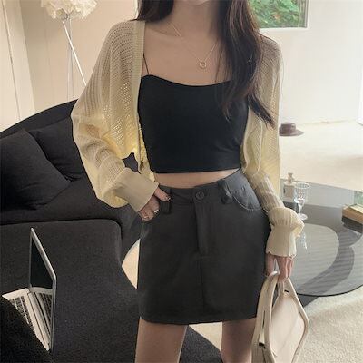 2024 春夏 ショート丈 薄手 カーディガン トップス 長袖 紫外線対策 UV対策 羽織り加工 きれいめ ライトニット オフィス OLネックカジュアルフレンチフェミニンファッション韓国レディース