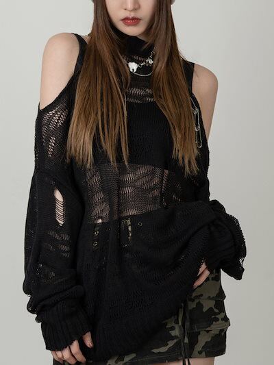 2024秋冬 長袖 ニット トップスストリート黑カジュアエコルシルエットプルクルーネックファッション加工色っぽ 女っぽ カジュアル 大人っぽ 上品 サイズフェミニン系ゆったりレディース系透かし編み