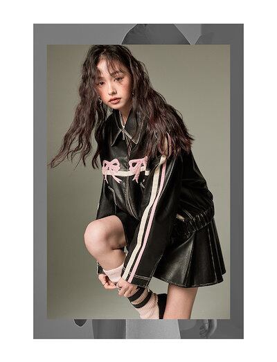 2024 春 甘くてかっこいい 長袖 韓国ジャケット かわいい ショート アウター ブラック 羽織りレディース合成 バイカラーカジュアル 女っぽ きれいめ ファッション 色っぽ 大人