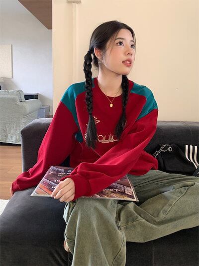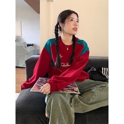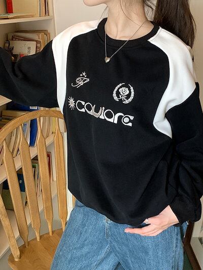 2024 秋冬 トレンド薄手トップスラウンドネックバイカラー長袖かわいいK-POPTロング黑白レディース韓国風ロゴ衣装ルーズゆったりプリントおしゃれサイズスリーブシルエットファッション系サイドシャツ