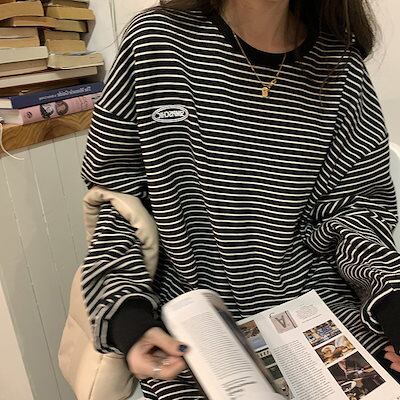 2024 秋 新 パーカー パーカー ゆるい カジュアル 縞 春秋の薄手のゆったりした新モデルです長袖 トップス トップス レディース 春 秋 韓国ファッション
