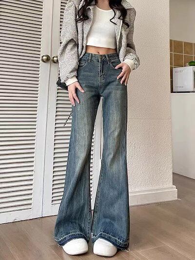 2024 初秋 デニムパンツ パンツ デニム ジーンズ スキニー ワイドレッグ ハイウエスト 脚長効果 美脚効果 細見え 水色 ライトブルー グレー カジュアル レディース お出 韓国ファッション