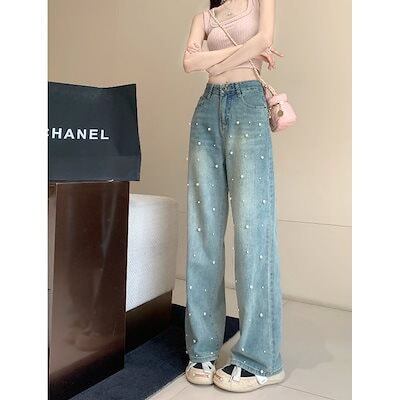 2024 初秋 デニムパンツ パンツ デニム ジーンズ スキニー レッグ ハイウエスト 脚長効果 美脚効果 細見え 水色 ライトブルー ストリート系 カジュアル ズボンファッション デザインお出 韓国