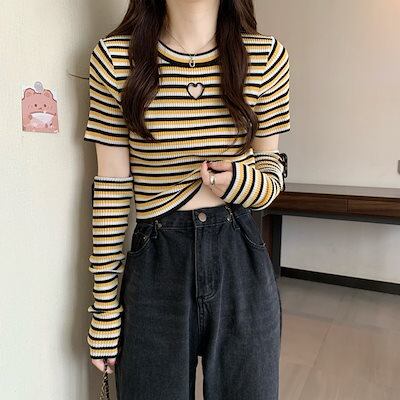 心 3 半袖/長袖 ニット ラウンドネック Tシャツ 着痩せ トップス カットソー + アームカバー レディース 春秋 ストレッチ カジュアル 快適 ファッション 10-30代