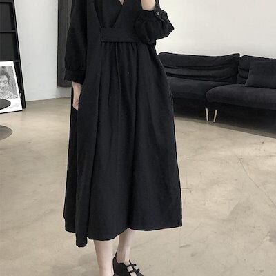 大きいサイズ レディース服 ワンピース ゆったり Vネック ロングドレス シンプル 百掛け カジュアルワンピース