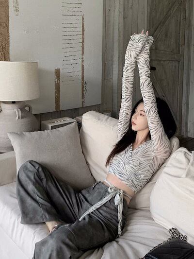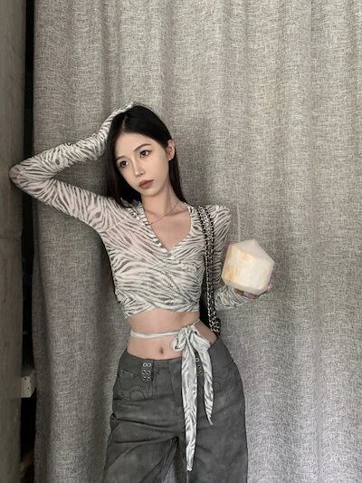 Tシャツ ゼブラ柄 長袖 ショート丈 着痩せ Vネック スリムフィット セクシー トップス カットソー レディース 夏 カジュアル ダンス ファッション ギャル 10-30代