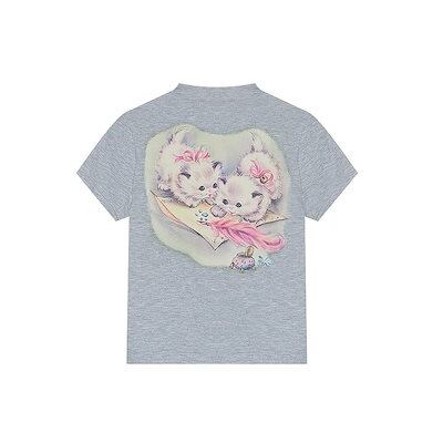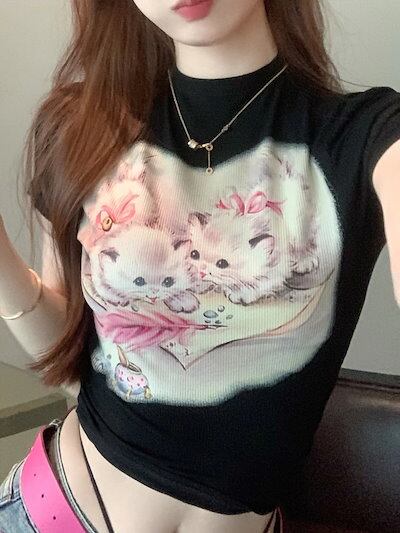 Tシャツ 半袖 ハーフネック ショート丈 ストレッチ 着痩せ スリムフィット カットソー ネコちゃん プリント プルオーバー トップス レディース ギャル 春 夏 かわいい カジュアル ファッション