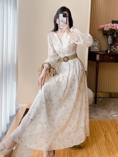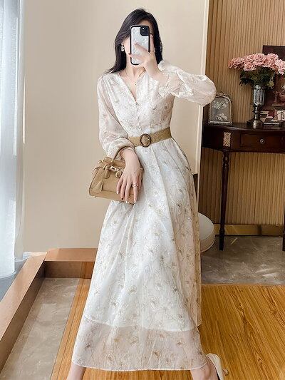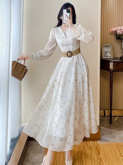 ワンピース 気品花柄着痩せシフォンワンピース2024年新作ハイウエストスリムロングスカート