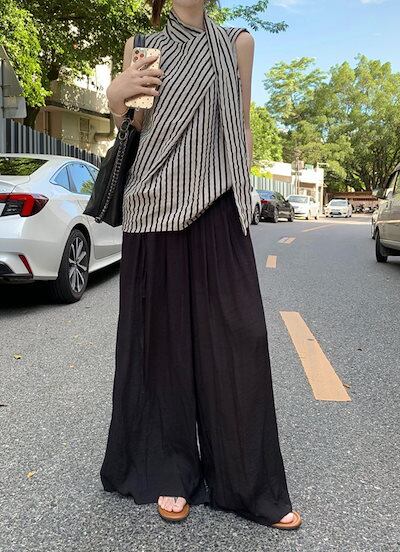 2024夏トップス シャツ ハイネック ストライプ ノースリーブ ゆったり 細見え 夏 黒 ブラック おしゃれ かわいい 大人っぽい 韓国ファッション レディース お出かけ