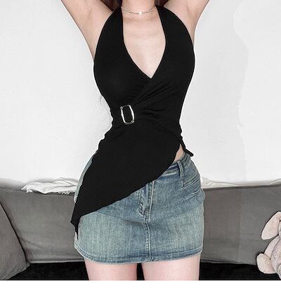 2024夏トップス セクシー キャミソールTシャツ ゆったり 細見え カラフル ツイストシャツ ネック おしゃれ かわいい キュート 甘め 黒 白韓国系ファッション レディース お出かけ