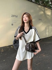 2024夏 韓国トップス ポロシャツ 半袖 Vネック ストライプ ゆったり 細見え 夏 白 おしゃれ かわいい 韓国ファッション レディース お出かけ