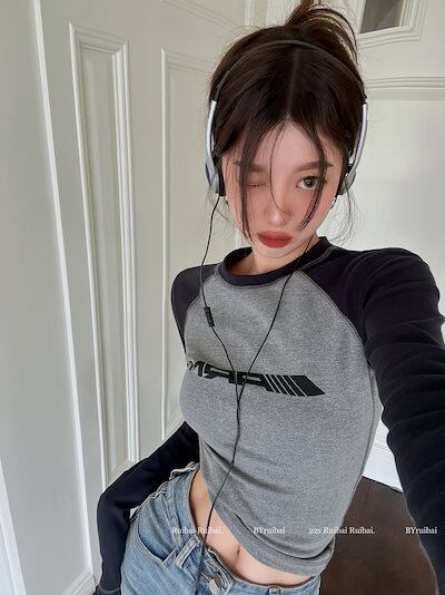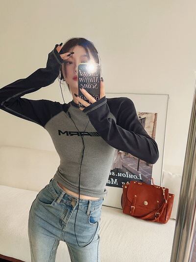 2024春夏 トップス 長袖 可愛い おしゃれ タイトフィット カットソー ラウンドカラー 重ね着丈 スリーブ 女っぽ レディース Tファッション系 フェミニン きれいめ 色っぽ プリント