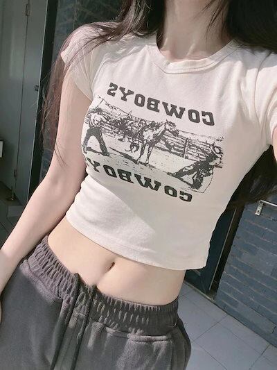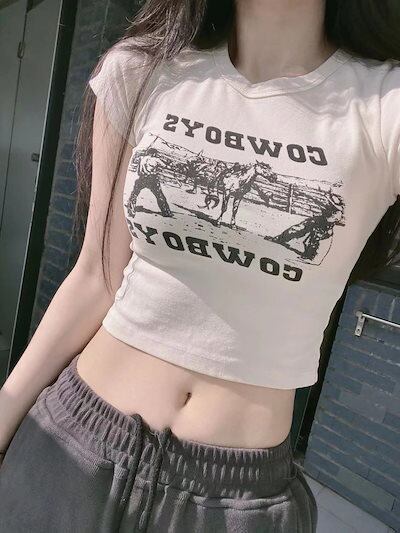 2024 夏 韓国 甘い トップス Tシャツ ラウンドネック丈 休日 フレンチ 韓国 ブラウス ファッション タイト スリムフィット丈短め ショート レディース へそ出し 休日 おしゃれ T