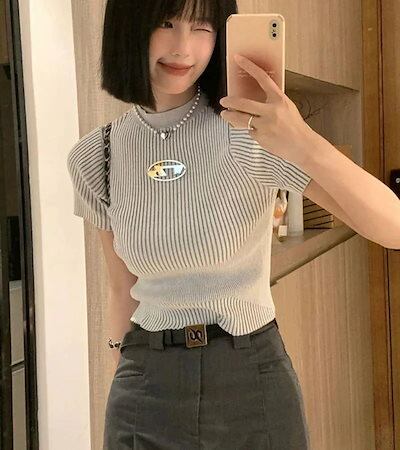 2024 夏 韓国 甘い トップス Tシャツ クルーネック丈 休日 フレンチ 韓国 ブラウス ファッション タイト スリムフィット丈短め ショート レディース 休日 おしゃれ T