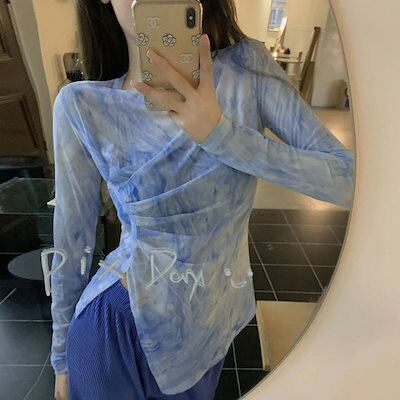 2024 夏 韓国 女度を格上げ tシャツ ファッション トップス 薄手 韓国系 長袖 薄手フィット プリント レイヤード 重ね着 肌見せ 女っぽハイフレンチタイト丈 レディース T