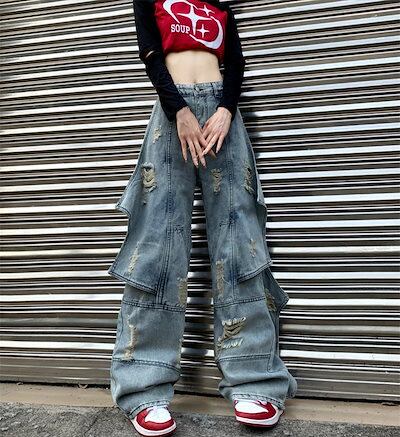 2024夏 韓国 4XL展開 ワイド デニムパンツ ボトムス ストレート パンツ ロゴ ズボン ファッション系加工韓国 レディース カジュアル パッチワーク 学生 スタイルアップ 色っぽ 女っぽ