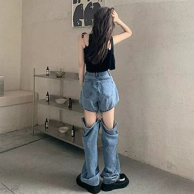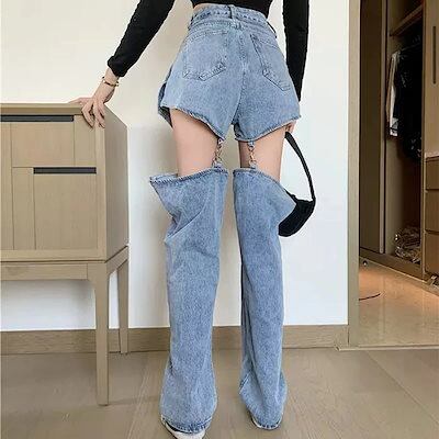 2024 春夏 韓国っぽ 最先端 デニムパンツ ワイドパンツ レディース ズボン ファッション ショートパンツ デザイン カジュアル 韓国系 メンズライク 美脚見え