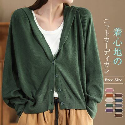 ニット カーディガン レディース 秋冬 カーデ フード付き フリーサイズ ショート丈 長袖 冷房対策 オフィス 前開き Vネック トップス 羽織り 無地 ゆったり おしゃれ 重ね着 部屋着 カジュアル