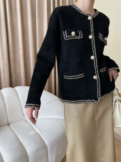 カーディガン ボレロ レディース 長袖 ノーカラー ニット パールボタン ジャケット アウター ノーカラージャケット ツイードカーディガン 春 秋 冬 ショート丈 丸首 無地 生地 きれいめ ツイード