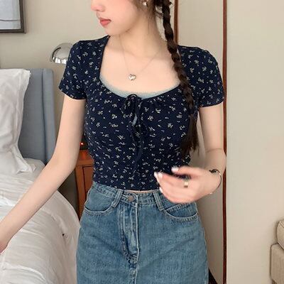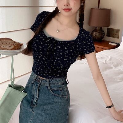Tシャツ レースアップスクエアネック半袖tシャツレディース夏新スタイル花柄ショートボトムトップス
