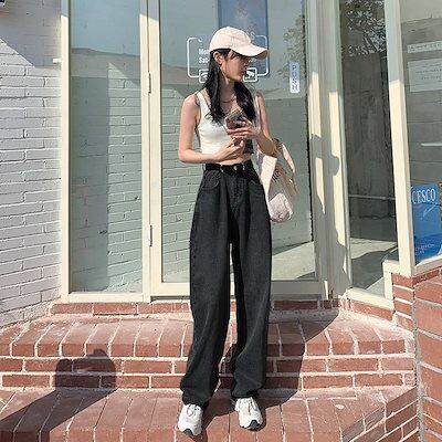 ハイウェスト ドレープ感 カーディガン ゆったり ストレートモップパンツ デニムパンツ レディース服 ロングパンツ 美脚