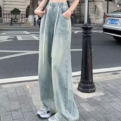 脚長効果!デニムパンツ レディースドローストリング ストレートモップパンツ デニムパンツ レディース服 ロングパンツ 美脚 長ズボン