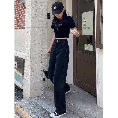 ブラック ハイウェストカーディガン ゆったり ストレート モップパンツデニムパンツ レディース服 ロングパンツ 美脚 長ズボン