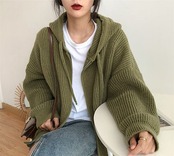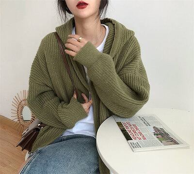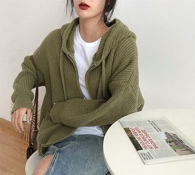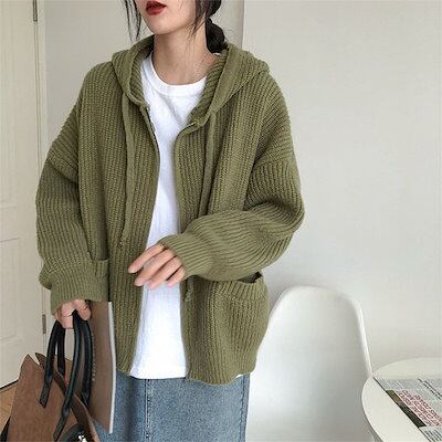 ニットパーカー レディース ジップパーカー 無地 カーディガン 長袖 ファスナー 春秋 ニットカーディガン セーター 羽織り リブ アウター フード付き トップス カジュアル シンプル 大人可愛い ゆ