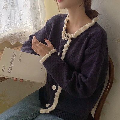 ベーシックニット ラウンドネックパッチワークラッフルトリム 春 長袖 レディース ニットウェア 新 ゆったり カーディガン 百掛け Tシャツカットソー 韓国ファッション トップス J-QD325