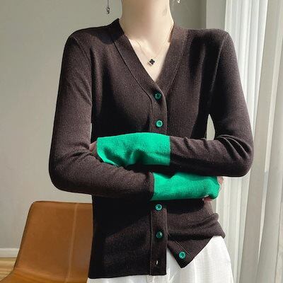 【Qoo10最安値挑戦!!!】 秋の新作フレアスリーブパッチワークカラー 長袖 Vネックカーディガン レディース 快適 アウター通勤30%までに制限