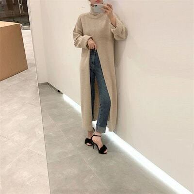 チュニック ニット チュニックワンピース 前スリット レディース ハイネック ニットワンピース 長袖 タートルネック セーター プルオーバー トップス キレイめ 通勤 オフィス 春 秋 冬 大きいサイ