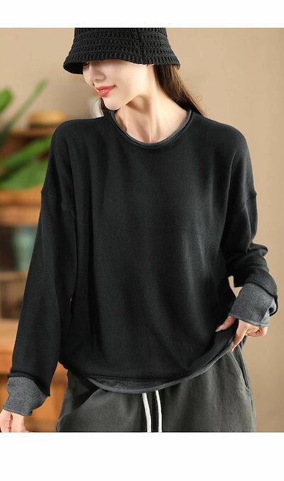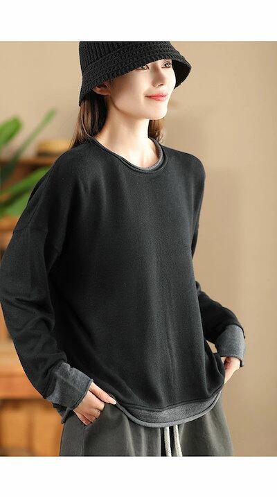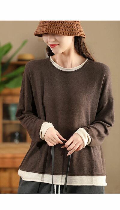 レイヤード風 カットソー レディース ニット プルオーバー チュニック 大きいサイズ トップス レイヤード ロングT 長袖 ニットセーター 長袖カットソー ラウンドネック 大きいサイズ ゆったり 体型