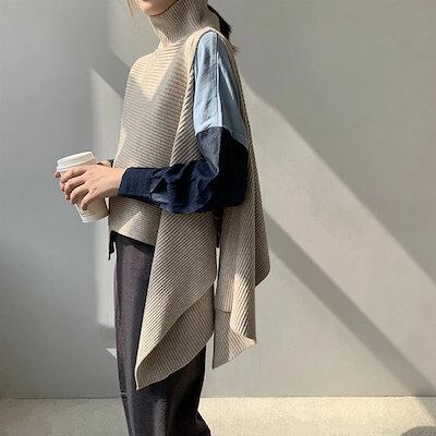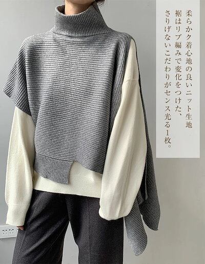 アシメニットベスト ベスト レディース ニット トップス ノースリーブ ハイネック アシンメトリー アシメ フレア セーター 重ね着 レイヤード モード とらみ 半袖 デザイン カジュアル おしゃれ