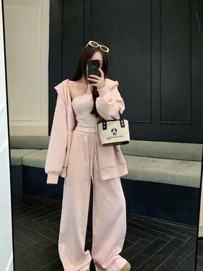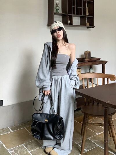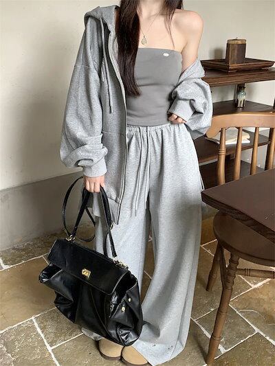 2024 秋冬 韓国 3点セット かわいい レディース フード付きアウター黑白フーディー ブルゾン長袖ショート丈トップスグレー冬カジュアルファッション系お出かけフル丈トラック高校生 通学大学生