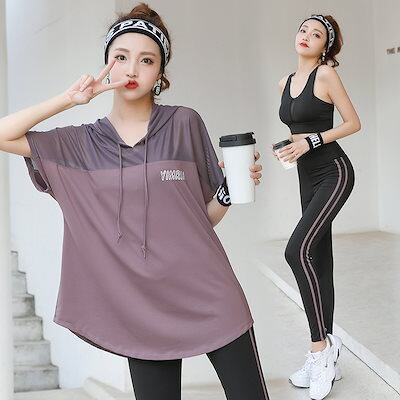 ファッションヨガウェア セットアップ ヨガトップス 3点セット 春夏ランニング Tシャツ ジム ランニング フィットネス スポーツウェア ジョガーパンツ 春夏秋 レディース 上下セット 運動セット
