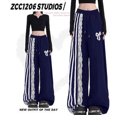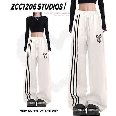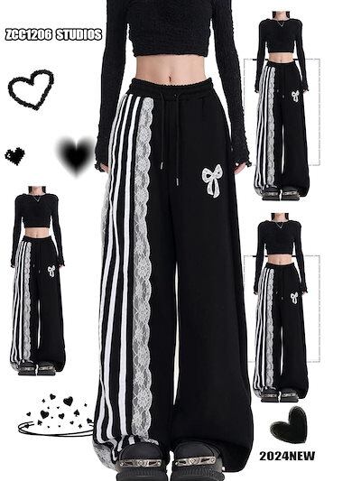 2024秋冬 パンツロング丈ストレート ストライプウエストゴム ハイウエストゆったり 脚長効果美脚効果細見え春カジュアル 黒白韓国系ファッションレディースサイドお出かけおしゃれ かわいい衣装 トラック