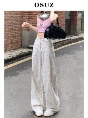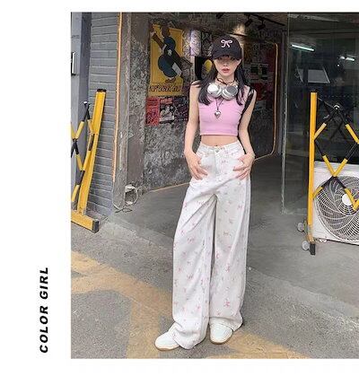 大人気 デニムパンツ 秋 新作 パンツ デニム ジーンズ 花柄 ピンクの花 ワイド ストレート ハイウエスト 細見え 春 白 ホワイト カジュアル ファッション お出かけ レディース 脚長効果 美脚効