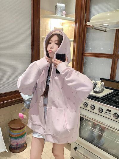 2024 秋冬トップス パーカー フード付き ジップ チャック 長袖 花柄 ポケット 大きめサイズ ゆったり 細見え 秋 水色 おしゃれ かわいい ガーリー キュート 甘め 韓国ファッション レディー