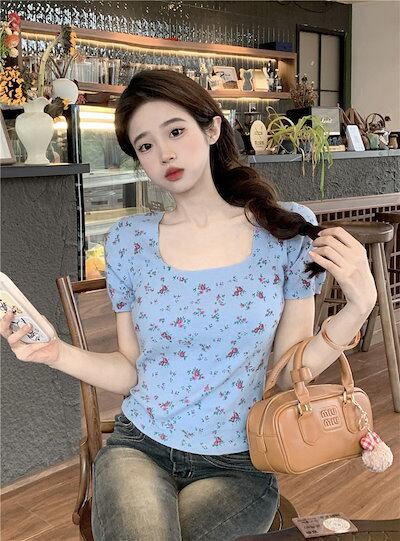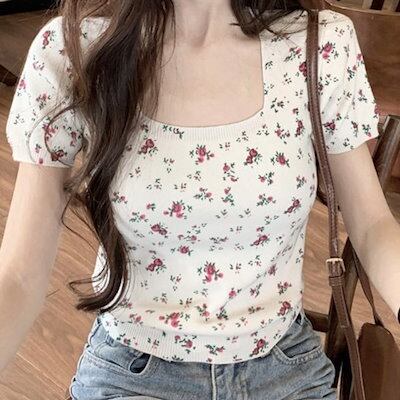 2024 夏 韓国トップス Tシャツ 半袖 スクエアネック 花柄 丈短め ショート スリム 夏 白 青 かわいい おしゃれ ガーリー キュート 甘め カジュアル 韓国ファッション レディース お出かけ