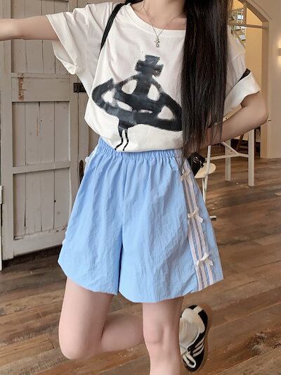 2024 春夏パンツ ショート丈 ワイド ウエストゴム ハイウエスト 美脚効果 脚長効果 細見え 短パン 黒白 おしゃれ かわいい 韓国ファッション系 レディース サイドお出かけ