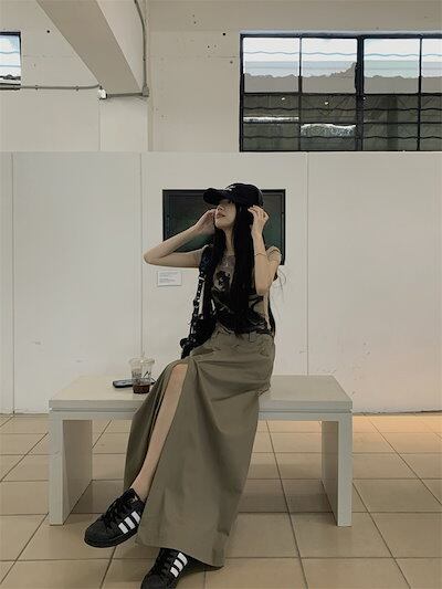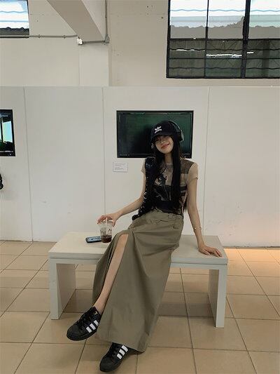 2024 春夏スカート ロング丈 Aライン スリット フロントオープン ハイウエスト 美脚効果 脚長効果 細見え 夏 カーキ おしゃれ かわいい 韓国ファッション レディース お出かけ