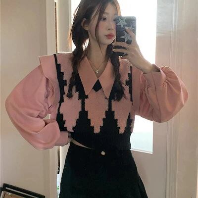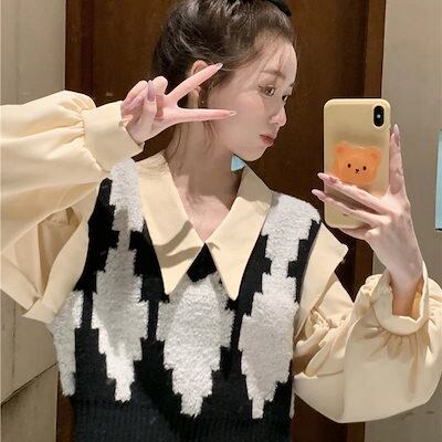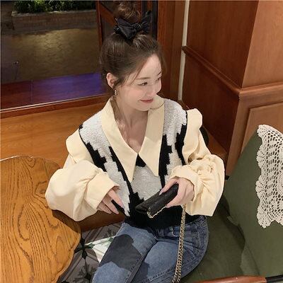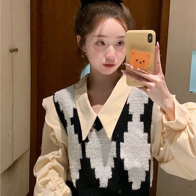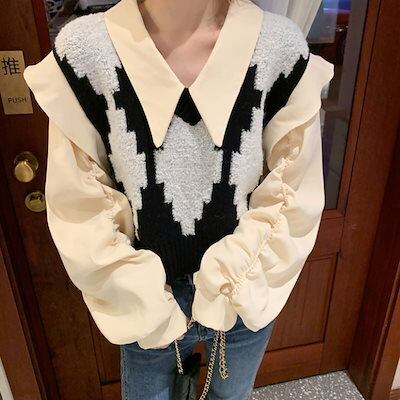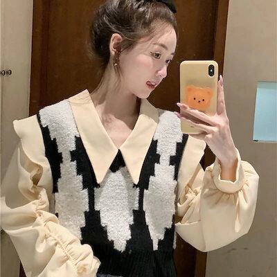 2024 春夏【2点セット】カジュアルにも シャツ ニット ベスト ブラウス バルーン ボリューム ショート風ゆったり ネック カジュアル きれいめ 韓国っぽ ファッション かわいい