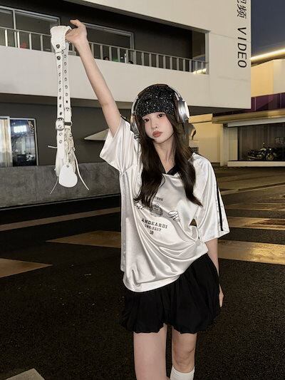 2024夏 韓国可愛い風トップス Tシャツ ロング丈 ファッション半袖スリムフィット サイド ペイントシルエット ゆったり 休日レディースサイズ韓国系ネック_おしゃれ カジュアル メンズライク T