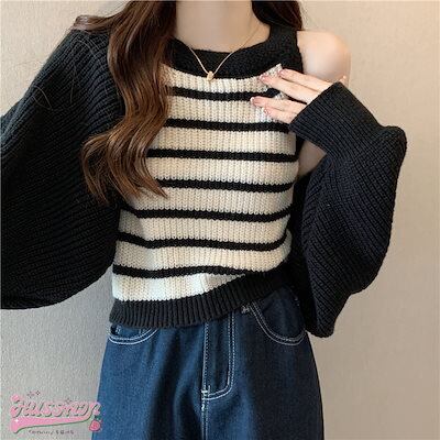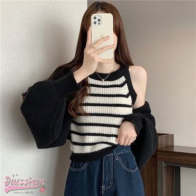 韓国抜け感が可愛い 2枚 トップス ニット セーター レディース 長袖 ゆったり かわいい カジュアル きれいめ スリーブ 夏 羽織り ファッションきれいめ 大人っぽ ショートタンクトップカジュアル秋