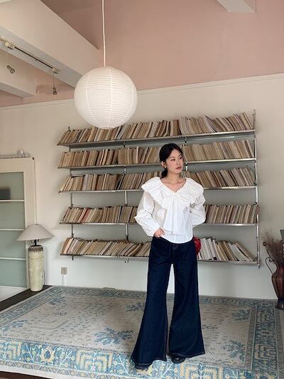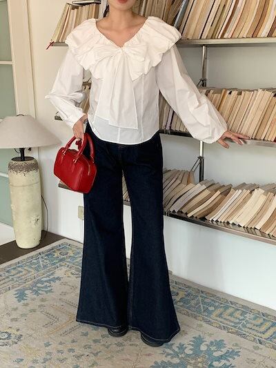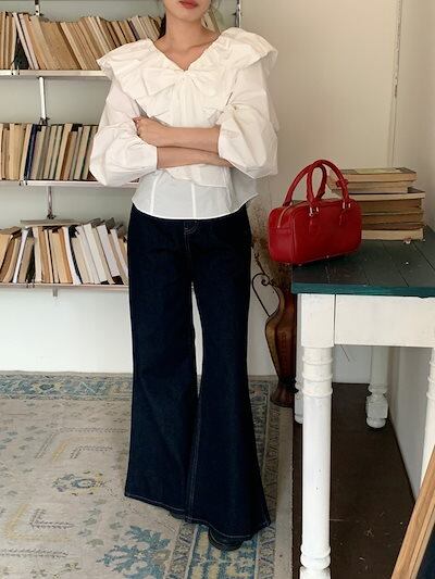 2024秋冬トップス シャツ リボン Vネック フリル 長袖 ゆったり 秋 白 ホワイト おしゃれ かわいい ガーリー キュート 甘め キレイめ 韓国ファッション レディース お出かけ