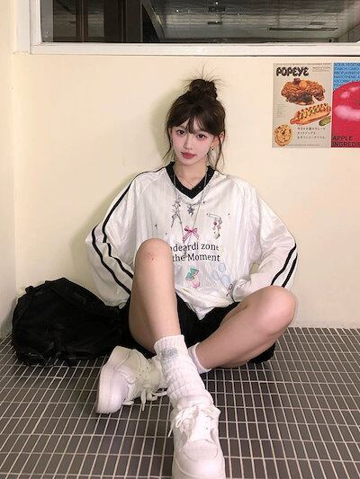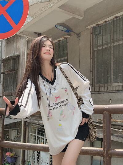 2024 秋冬 トップス 長袖 かわいいVネック Tシャツ レディース 韓国風 ロゴ衣装ルーズ ゆったりカジュアルおしゃれサイズスリーブシルエットファッション系サイドシャツフットスウエット春